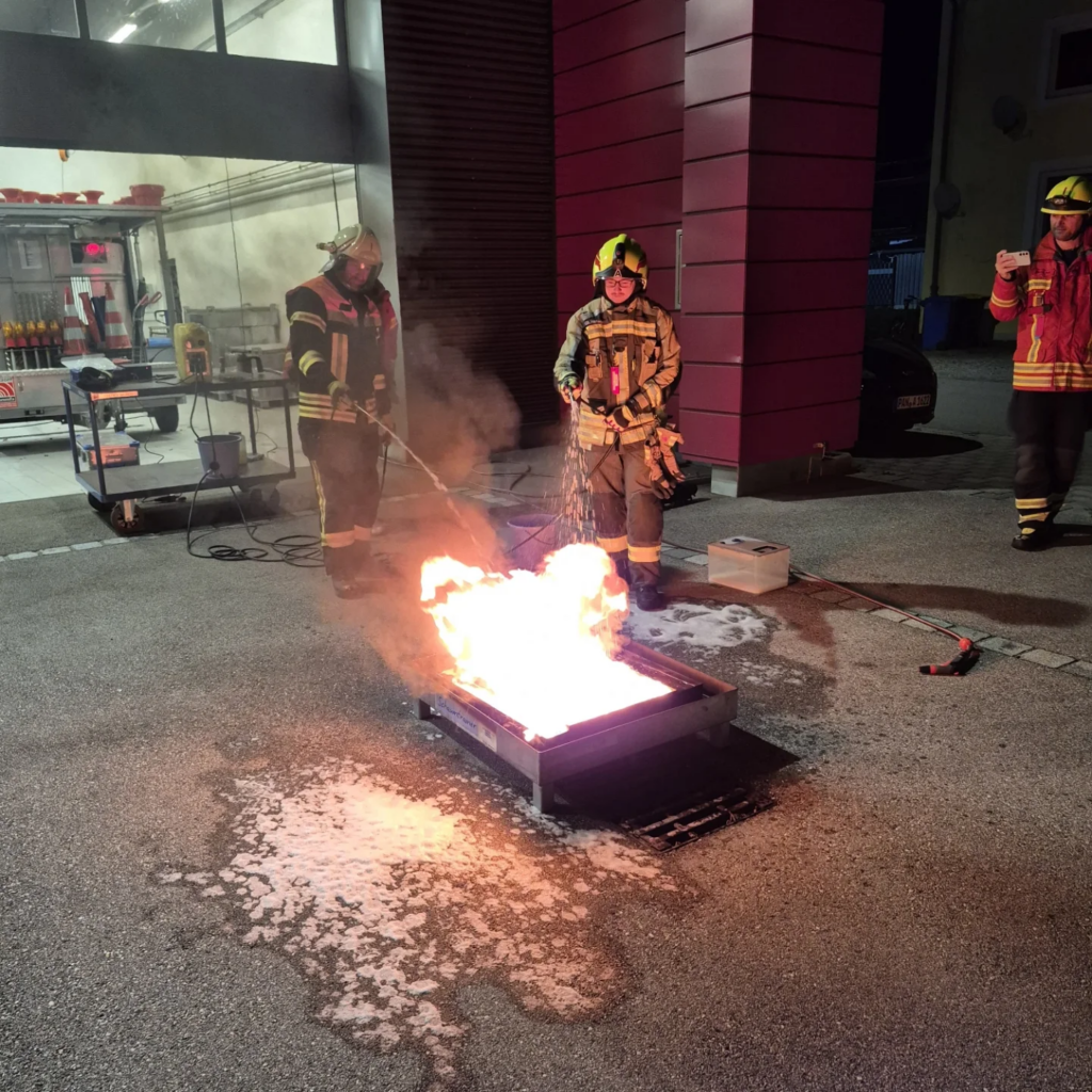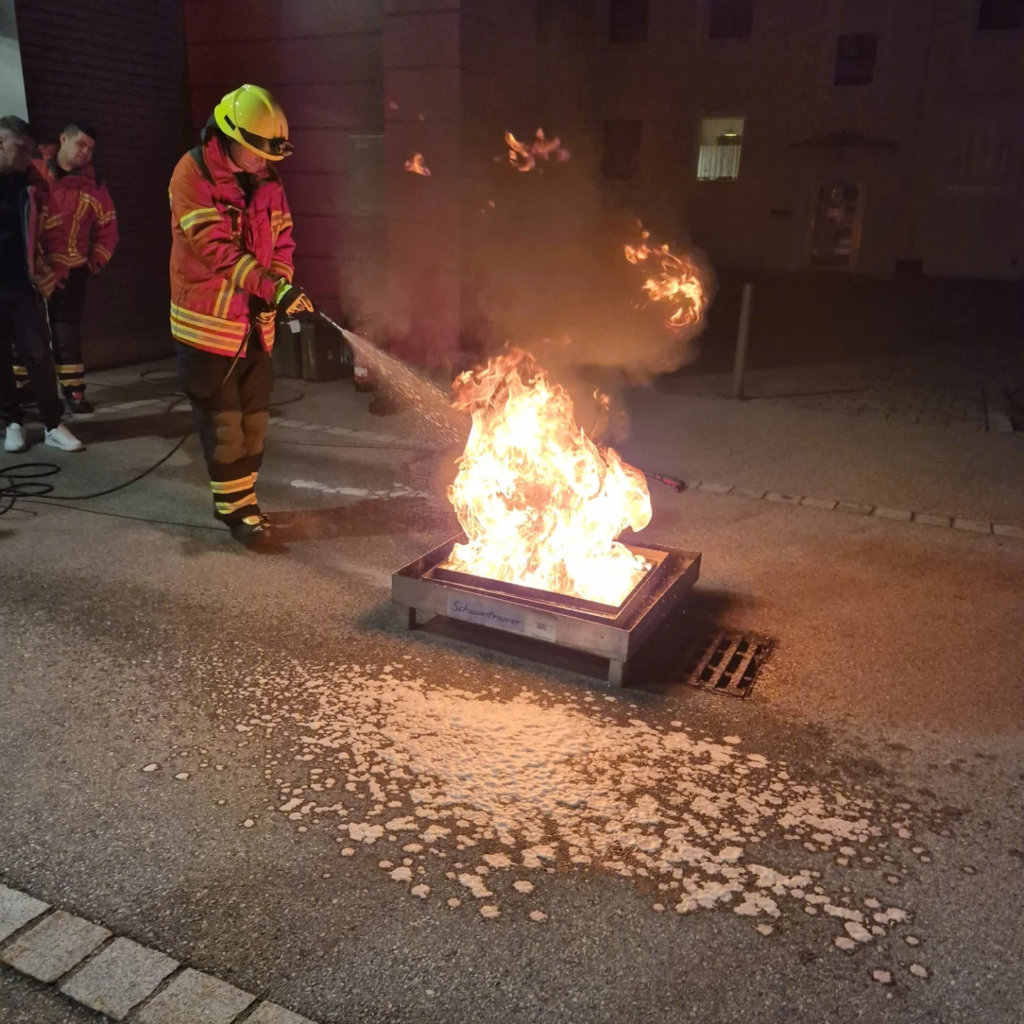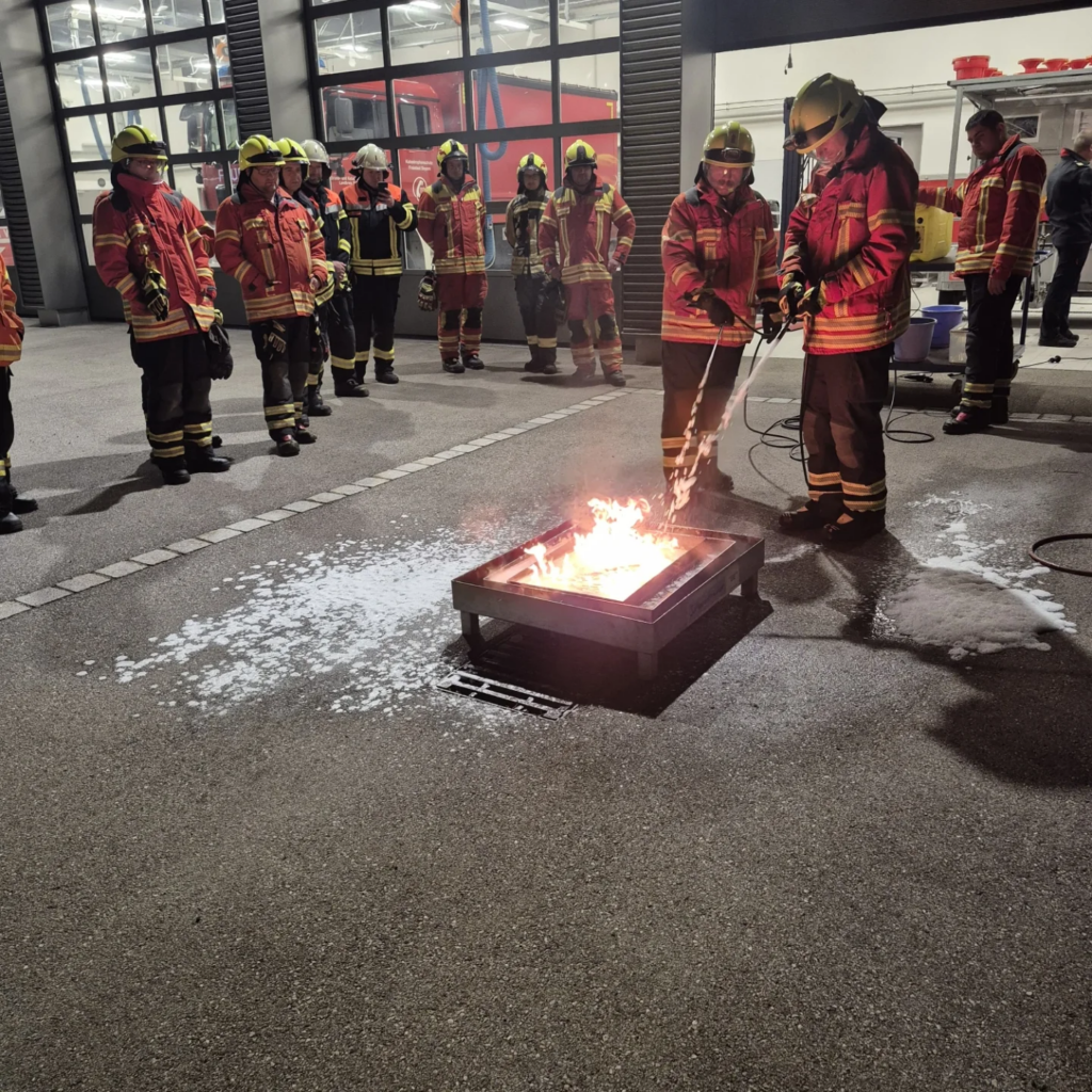 Nach einem Theorieteil, welcher unter anderem den richtigen Einsatz von Schaum und dessen Umweltproblematik beleuchtete, wurde im Anschluss mit dem Schaumtrainer und umweltfreundlichem Übungsschaum selbst geübt.